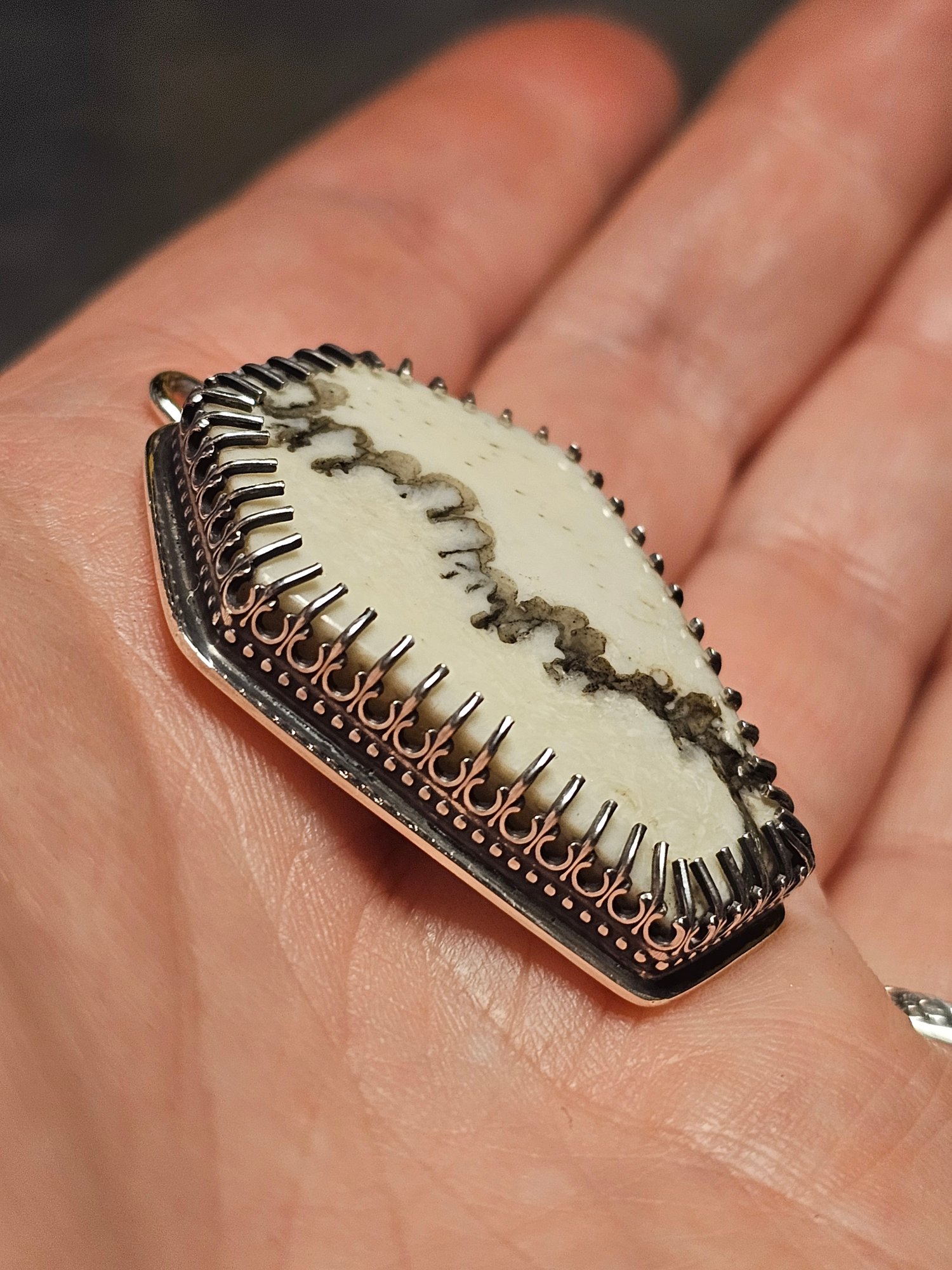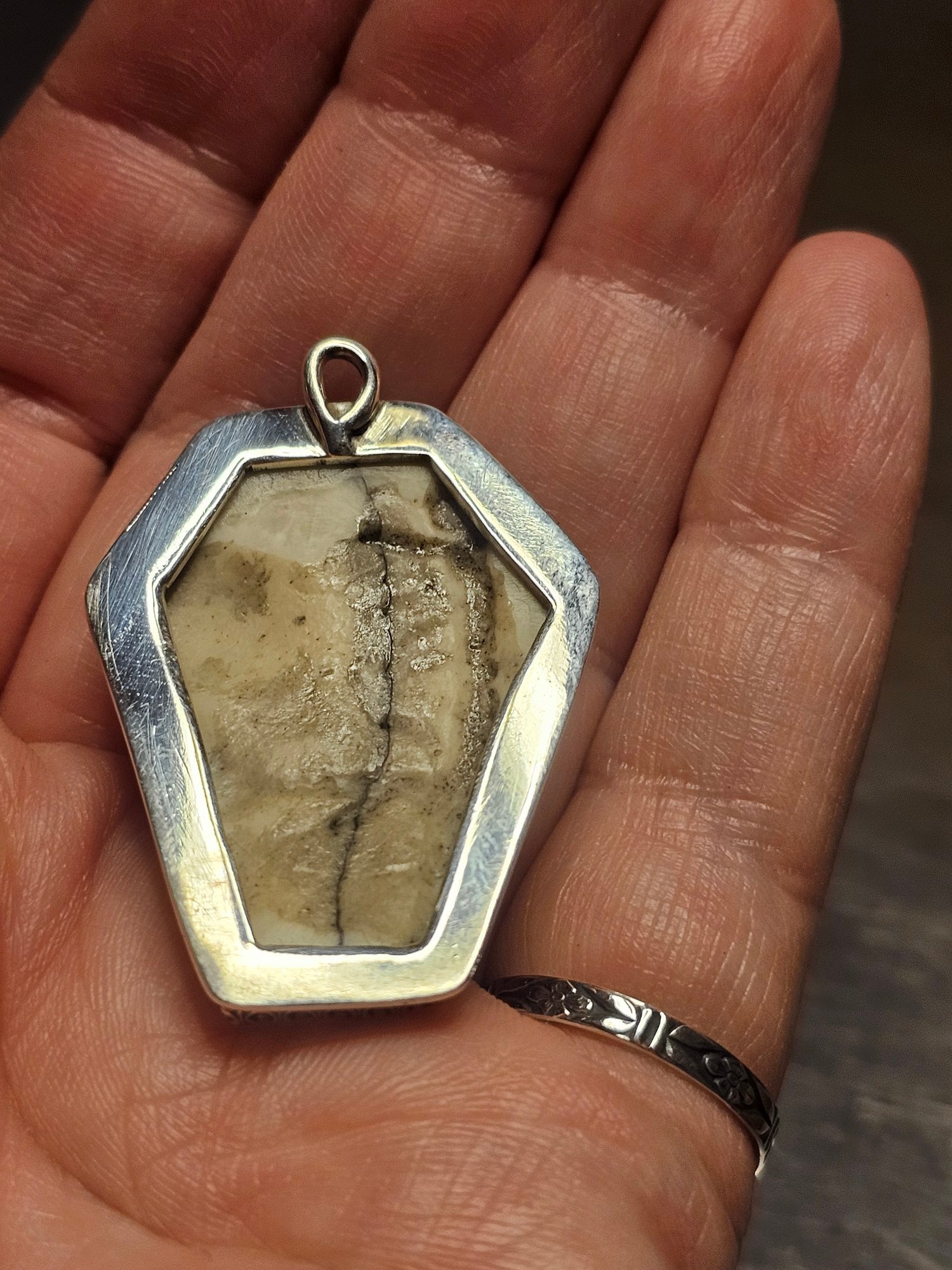 Hello my creepy cuties!! The glamour ghoul has returned, and I've got more dead people to show off. Yet another epic collab with the supremely talented @skulls4all_mc . An absolutely deadly darling, made from an ethically sourced retired medical specimen, a truly stunning piece of human skull. This one was a bit of a challenge, due to the natural curve of the calaverium, and the dramatic coffin cut, but I prevailed. And she's GORGEOUS. The coronal sutures are such a spectacular, and natural black, polished to perfection, by my bone wizard, Rich. I chose a high, gothic fence style for the bezel, to fully protect, and frame this beauty. Full sterling silver construction, naturally. And as always, to show off the incredible internal structure of the skull, I skeletonized the back. (heehee) Blacked, and mirror polished to gleaming majesty, fit for the neck of any gothic royalty. There is only one like this, in this size. It can be put on any chain, as is, or a custom beaded chain can be made to order. I love the dead, do you? 💀