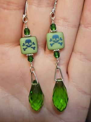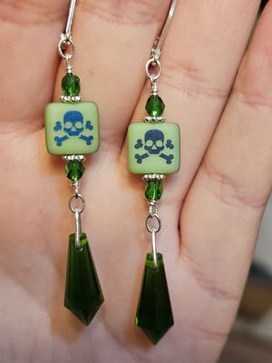 Spooky season is in full swing, I bring you my first offering. Poison has always held a special place in history, from Aqua Tofana, Socrates, the Borgias, to Shakespear, the deadly little bottle has always held a place of infamy. It was also a color to die for, literally. Arsenic green, or Paris green was a wildly popular color in the early 1800's, due to its vibrancy, and longevity. However, it came with a hefty price, death. As the name implies, arsenic was a key component in the emerald green dye, which could be easily absorbed through the skin, from clothing, inhaled as a dust from fashionable wallpaper, or accidentally drunk in paint water. Today's drop is an homage to the deadly dye, with a classic skull and crossbones motif, and scintillating drops of emerald green malice, dangling below the grinning death's head. All wirewrapped securely on sterling silver wire, antique crystals of three variants, sway hypnotically. Your choice of rounded faceted drops, angular sharp points, and smooth green metallic tears. As always, they swing from sturdy sterling leverback hooks, to ensure all day comfort, and peace of mind. Which style is your favorite? Pick your poison. 😉