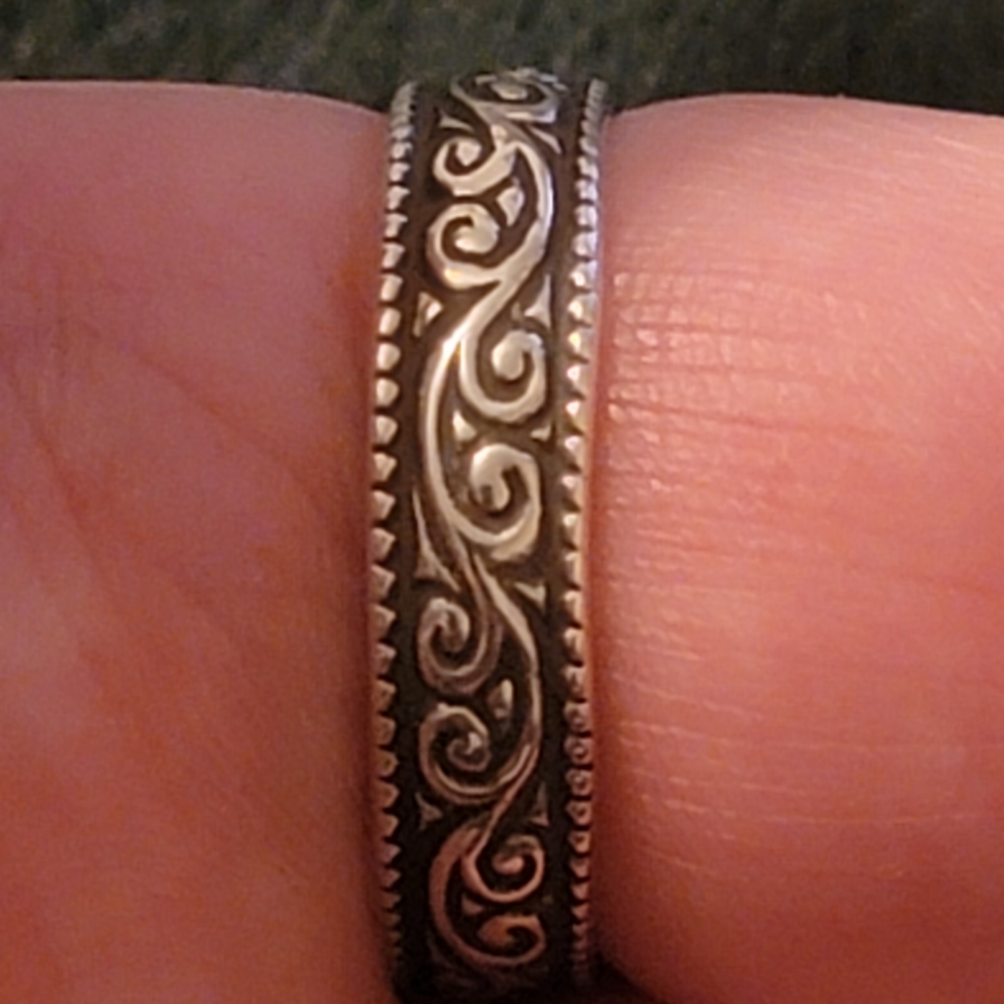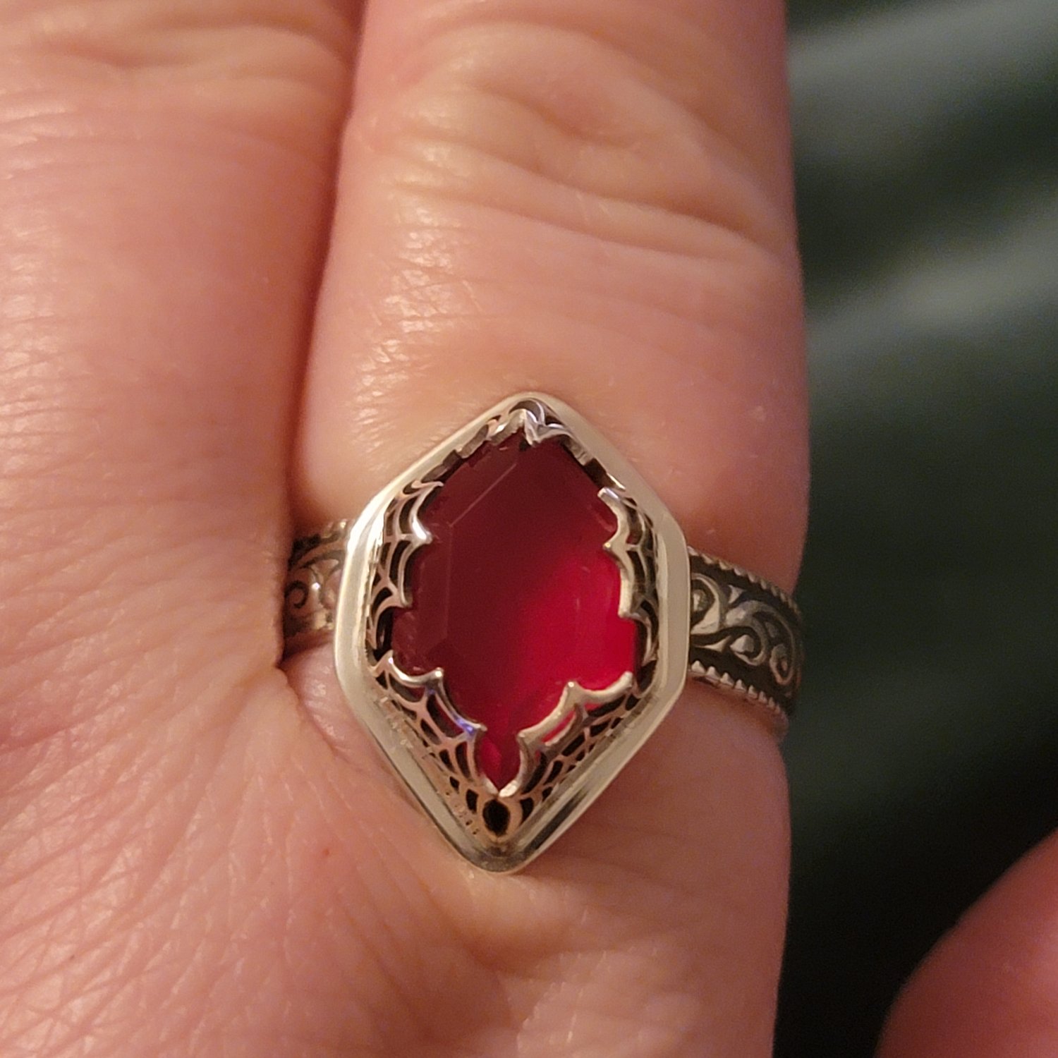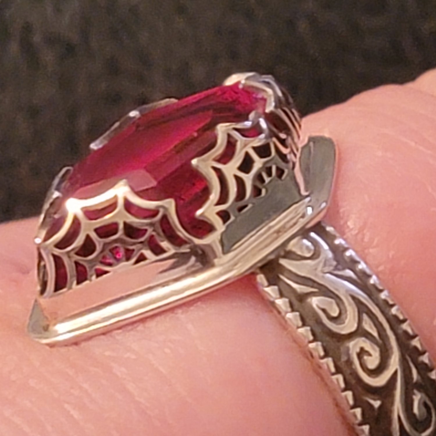 Happy October darlings!!! It is *OFFICIALLY* my season, let the creepy times roll!! To kick off my favorite month of the year, I'm dropping a brand new spooky design. A truly jaw dropping gem, an incredibly unique shape, of an elongated 15mmx10mm faceted hexagon, in blood red antique Cadmium glass. This unusual jewel is wreathed in a very precise bezel of delicate spider webs of brass or stering silver. The jewel is mounted on an exquisitely patterned solid sterling silver, 5mm wide shank of Victorian scollwork, hand antiqued and polished to an incredible gleaming sheen. I hand shape and polish the insides and edges of each band to an extremely smooth and comfortable finish. I can assure you of this being one of the most comfortable rings you've ever worn. Each of these amazing baubles is custom made to order, so no worries about not having your size in stock. This spooky darling also has a secret, it glows orange/red under blacklight and UV, and looks even more captivating, at your next Halloween party or event. If this sepulchural sweetie is calling your name, get one of your own today, before she fades into the ether.