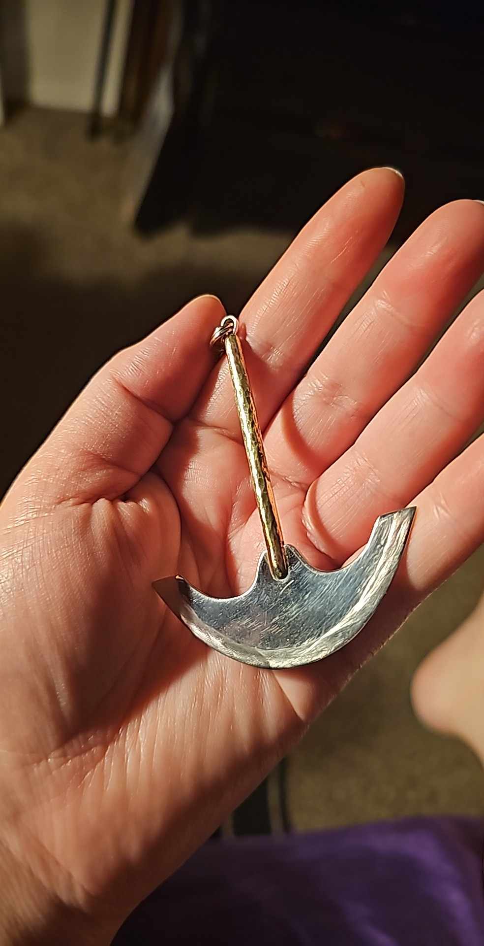 While stuck in bed, I was revisiting some Edgar Allen Poe, and was instantly inspired to create. I had to quell the urge, placating my muse by drafting design templates, since I was in no shape to jump into my studio at that point. A few days later, this bladed beauty was born. Most of you probably already know what story stirred my creative juices, but for those who don't, this comes directly from one of Poe's most chilling tales, The pit and the pedulum. Nothing scarier than seeing your death, relentlessly, slowly swinging its way to you, closer with every swipe, as you lie strapped to a table, helpless. If you've followed me for any length of time, you'll know I grew up in my father's custom sword, and knife smithy. All my miniatures, are made exactly the same way the full sized versions are. The blade was deftly hand sawed from a sheet of silver, and securely soldered into a split solid rod, of hand hammer textured brass. Polished to a high gleam, but left somewhat scarred, speaking to its deadly duties. It's a substancial piece, with a comfortable heft. The edge, while it looks wickedly sharp, is 100% safe, and blunt. I have slept in this pendant before, with no ill effects. A conversation starter, to say the least. This one is available for purchase immediately, get it before the inquisition does. 😉