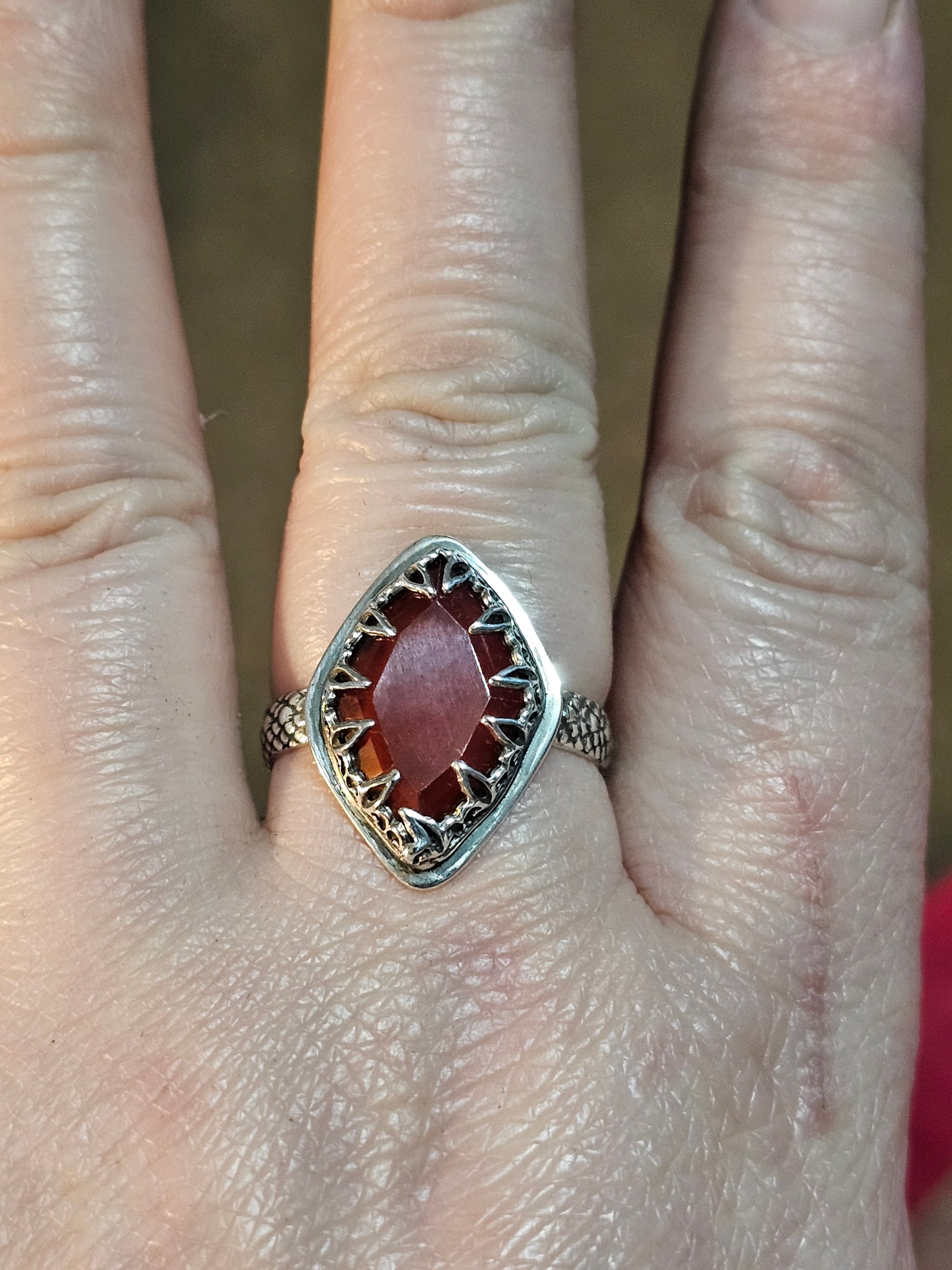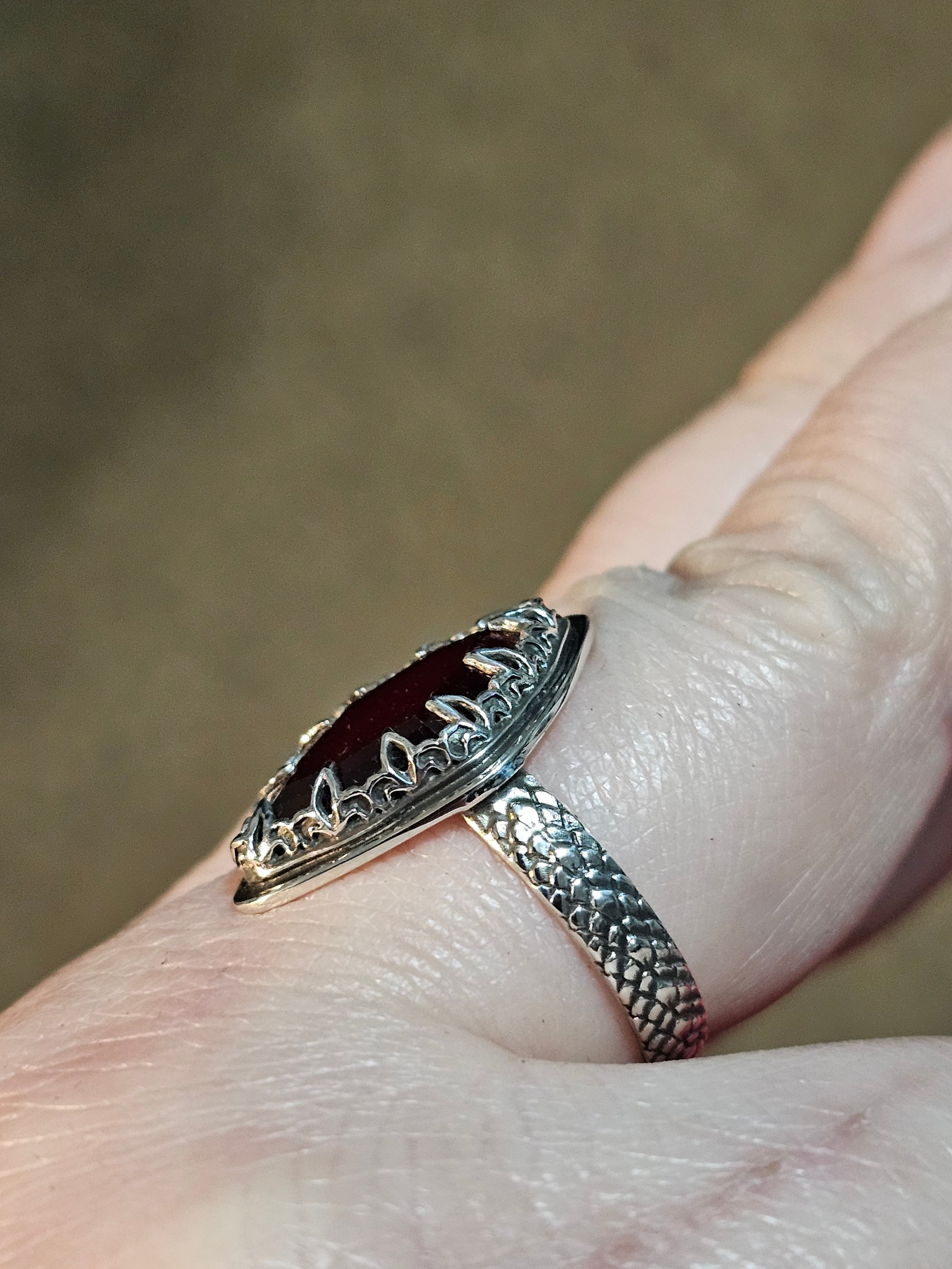 I bring you a new slice of gothic glamour. The second ring addition to my Vampire's kiss line, the Venus mantrap. While making this piece, the shape just screamed divine feminine, as it were. π So, I went with it. Gleaming fangs ring a blood red faceted garnet, in a positively predatory way. To further enhance that nature, I placed it atop a shining sterling snakeskin ring shank. Blackened the silver to bring out all the details, and polished to a near mirror shine, she's a deadly dame, one that commands attention. This ring is available for immediate sale, in a US size 9ΒΌ, and I have *ONE* more gem in this style, if you need it in a larger, or smaller size. And don't worry, she doesn't bite, often. π